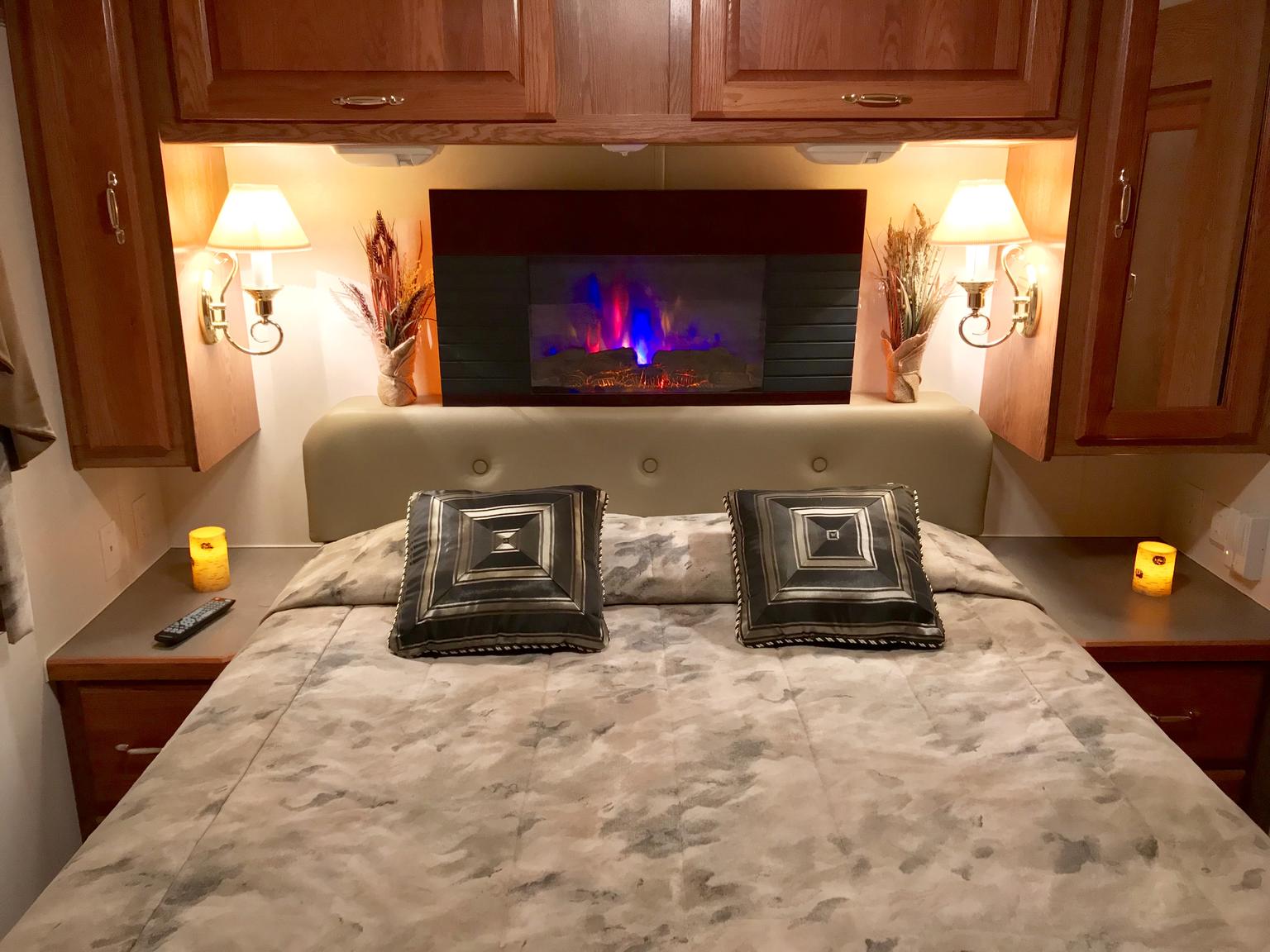 This is an electric fireplace. The flame and background colors can be changed with the remote control.