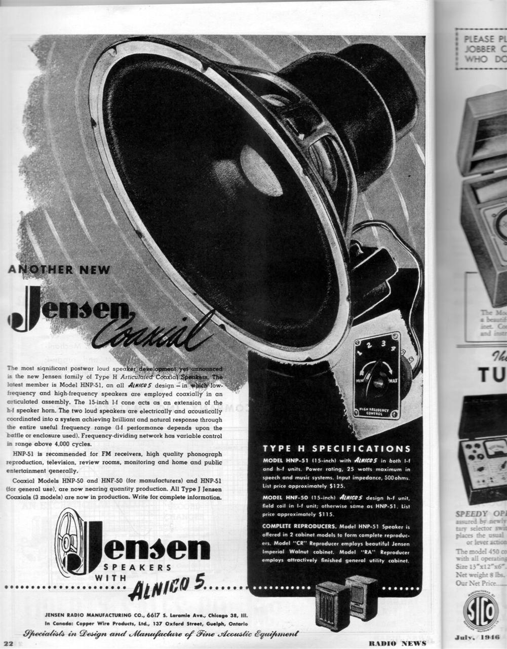 Jensen_HNP-51_Radio-News_July-1946 (Custom) (2)Radio News - July 1946, Page 22 - Jensen HNP-51 Advertisement